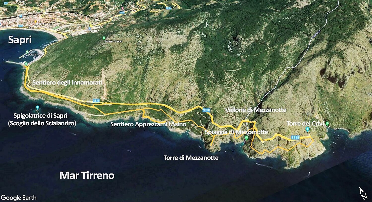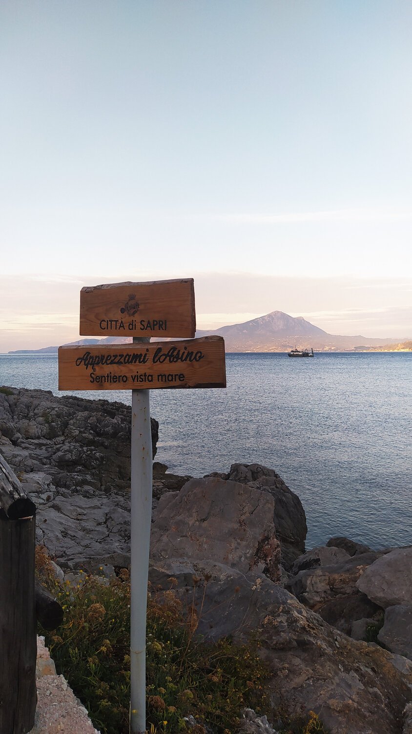 Partenza dal Residence Il Villaggio Elios alle 8:00 con arrivo al Residence Villammare alle 8:20. Raggiungiamo il porto di Sapri e da qui comincia il nostro meraviglioso percorso. Di circa 6 km ha una durata di 2 ore. Il percorso è nella sua prima parte ben pavimentato con andamento pressoché pianeggiante. Il colpo d’occhio sullo scoglio dello Scialandro è notevole: qui si può osservare la scultura dedicata alla Spigolatrice di Sapri, ispirata alla celebre lirica di Luigi Mercantini. Superato il posto di ristoro prossimo alla sorgente Ruotolo, il sentiero diventa meno ampio ma comunque comodo. Successivamente si imbocca una sterrata che porta alla base della Torre di Mezzanotte, compresa nel sistema di avvistamento delle torri costiere vicereali. Da qui in poi il sentiero acquista maggiore fascino sia per i panorami che offre che per le oggettive difficoltà che presenta. Dal Canale di Mezzanotte (che segna il confine tra la Campania e la Basilicata) al punto ove non è consigliabile proseguire a causa delle pessime condizioni del tracciato (interessato da crolli dei muri a valle che hanno reso pericoloso avventurarsi se non esperti e muniti di adeguati supporti tecnici) il Sentiero Apprezzami l’Asino regala viste impareggiabili, che lo mettono in competizione con altri percorsi più conosciuti.